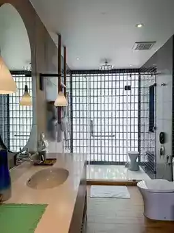 The room is well-proportioned, with a balcony separating the bedroom and bathroom.
