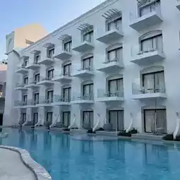 A beachfront hotel that gives off a Santorini feel, decorated in blue and white to make you feel comfortable. Let me tell you that you can take pictures from every angle. Content creators definitely can't miss this. 📸