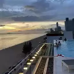 The swimming pool looks clean and is very beautiful when photographed. The nearby bar also has a Happy Hour promotion of 1 get 1 free. If you stay here, don't miss it. 🥂🍷🍻