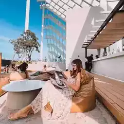 There is a swimming pool and bar. There are photo spots in almost every corner of this floor. There is also a beach-like seating area on the rooftop. Anyone who comes to this hotel must come up and take photos here.