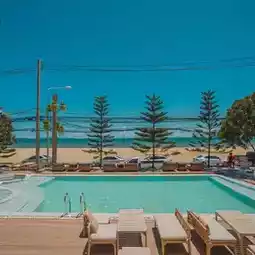 Decorated with brown-cream furniture contrasting with the turquoise swimming pool, there are both indoor and outdoor areas to choose from.
