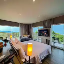It is a room with a balcony on both sides that can see a panoramic view of the sea. The room is very spacious. There is a sofa set, a work desk, a robe, slippers, a mini bar (with a fee), a bathroom, a shower, and a bathtub, all separated.