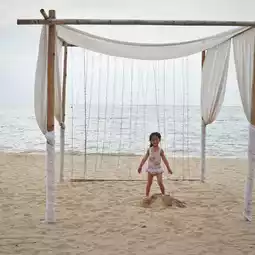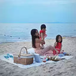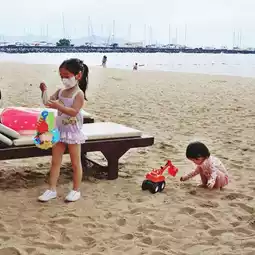 🏝️ A quiet, clean beach where you can sit and relax or bring your kids to play on the sand all day, morning, noon, afternoon, evening. There are palm trees providing shade. It's not hot at all. I love this place so much. I want to sit and play on the sand whenever I want. Don't be afraid of the heat at all.