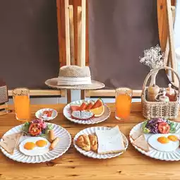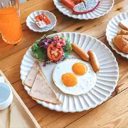 Breakfast is served floating on a clear tray. Floating in the water is cool.