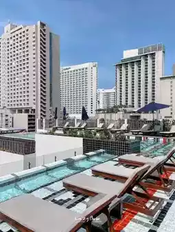 The accommodation also has a cafe. The decoration is very beautiful and cool 😎 The swimming pool is on the 8th floor with a city view. It's not a very big pool and is next to the bar. It's decorated cutely and has a bit of a Balinese style. It's so much fun to take pictures. So pretty!