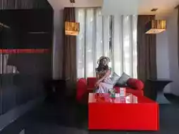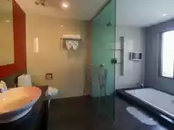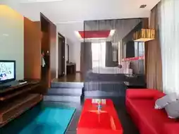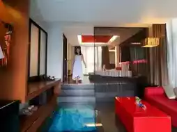 The room is next to the pool. Step out of the room and you can get into the pool. Adding to the chicness is the glass floor in the room. You can see the floor as a cool swimming pool. Inside the room, there are complete amenities and there is also a bathtub with a small TV. Soak in warm water and watch TV