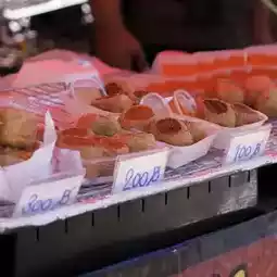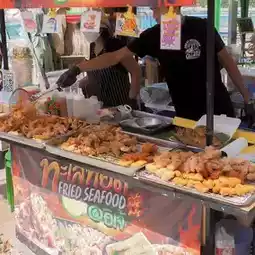 The market here sells mostly food. Each shop looks very delicious, such as giant crab meat rolls, crispy fried chicken, seafood, papaya salad or spicy salad. In addition, there is a slow bar, coffee, various drinks and the must-try is the squid sashimi, delicious and crispy. Every time I come here, I have to buy it every time.