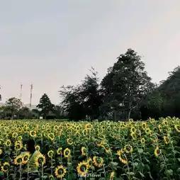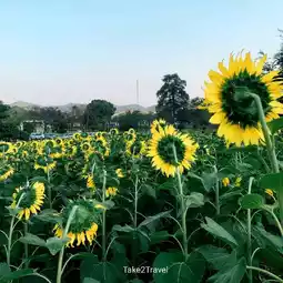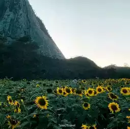 The sunflower fields are located in Khao Chi Chan, next to the carved rocks. The entire field is in full bloom, with both fully bloomed and growing sunflowers.