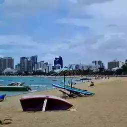 #Pattaya attractions Pattaya Beach is a famous tourist attraction in Bang Lamung District, Chonburi Province. It is easily accessible from Bangkok in just 2 hours. There is also an airport nearby at U-Tapao, making it even more convenient for tourists without having to go through Bangkok. It is a kilometer-long beach with gentle waves and suitable for swimming. During this time, many foreign tourists come to relax, as well as many Thai tourists. Pattaya City has organized activities to accommodate tourists, each month being different. In addition, Pattaya has many facilities, hotels, restaurants, and convenient transportation, with a songthaew service along the beach at a local price of only 10 baht, which is considered a world-class tourist city.