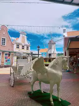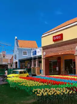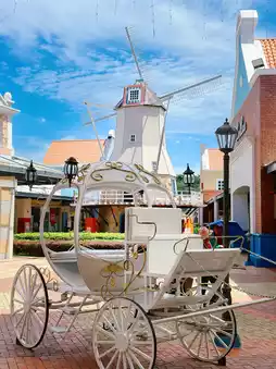 🌟 Built as an open-air mall, the heavily greened landscape includes five water features, a lake, four parks and lawns, a windmill and a carousel.