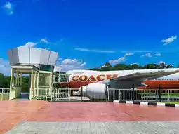 Start by admiring the impressive exterior—snap a sunny photo of the "COACH" logo on the airplane fuselage set against blue skies and fluffy white clouds. Head inside and wander through the modern retail hall.