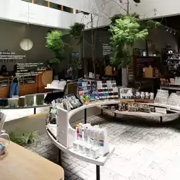 A compact shop, simply decorated in white and wood tones, giving a warm feeling