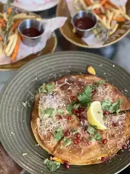 🫓 🥘 The OG quesadillas are a delightful fusion of flavors and textures. Inside, you'll find fluffy scrambled eggs cooked to perfection, providing a soft and creamy base. Topped with grated parmesan and pomegranate. Complementing the eggs are slices of savory chicken ham, adding a meaty richness to each bite. To balance the flavors, there are also slices of fresh tomatoes, offering a juicy and slightly tangy contrast. All these ingredients are enveloped in a warm tortilla and grilled to crispy perfection, creating a mouthwatering dish that blends savory, creamy, and fresh flavors harmoniously. It's a popular choice for those seeking a satisfying and comforting meal at the cafe 😋