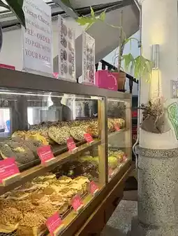 🥯🫐 The sweet and salty bagel starts with a hand-roasted bagel that provides a crunchy exterior and a soft, chewy interior. Spread generously on the bagel is a mixed berry cream cheese and maple syrup, offering a sweet and tangy flavor profile that perfectly complements the savory elements. You'll find crispy streaky bacon, adding a rich and salty contrast that enhances the overall taste experience. Sliced bananas are layered on top, providing a natural sweetness and a creamy texture that pairs beautifully with the other ingredients. Sprinkled over the bananas are chia seeds, adding a subtle crunch and a nutritional boost. It's a popular choice for those looking to indulge in a flavorful and satisfying breakfast or brunch at the cafe 😚