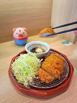 A large portion of fried pork chop is enough for two people. The pork chop has a crispy skin and tender meat. It is delicious with sweet sauce.