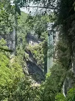 On the second day, we went to Ayi River and Chiyou Jiuli City. Chiyou Jiuli City was close to where we stayed, but personally, I didn’t find it interesting. We just took a photo outside and left. The ticket price was not cheap; I think a 20 yuan cap on tickets would be more reasonable. Ayi River was worth visiting, but transportation from the county town to Ayi River was a bit troublesome. It was hard to find a direct route on the map, and taxi fares were high. For a distance of about ten-plus kilometers, the taxi app showed 60 yuan, and the driver said he had to cover the empty run cost. So, driving yourself is the best option for places like this. Here’s the key tip: I’m sharing a budget-friendly way to get to Ayi River. We took a taxi to Dahegou at Aohua Plaza, where there is a “Snack Busy” store. Right opposite the store, you can see a bus stop. For 8 yuan per person, you can take a direct bus to Ayi River, which is super cost-effective! The trip takes about half an hour, and there might be slight delays due to passenger drop-offs, but this price is very reasonable. After arriving at the scenic area, we chose to hike the entire way without taking the elevator. Actually, the hike wasn’t tiring; walking all the way down took about 20 minutes if you’re quick.