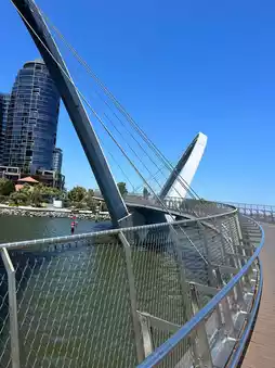 The iconic BHP Billiton Water Park, with its interactive water features, is a fantastic place for families to have fun, making it a lively spot for children and adults alike. Additionally, the striking bridge and the nearby artwork, such as the famous"Eliza" sculpture, add a unique artistic flair to the area, perfect for capturing memorable photos.