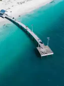 A seaside town with white sandy beaches and a curved jetty perfect for photos.