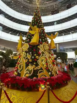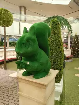 The giant Christmas tree steals the show with its golden ornaments and angel decorations, standing tall in the center of it all. Everywhere you look, there are beautiful touches – from the perfectly shaped garden topiaries to adorable green sculptures, including a playful squirrel and a cute bear.