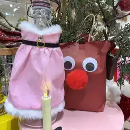 What caught my eye the most was the pink Santa bottle cover—it was so unique and adorable! 🩷 The little details, like the glowing candlelight and the cozy knitted reindeer ornament, gave the place a warm and cheerful vibe. The rustic holiday setup with miniature trees, gift boxes, and pops of red and green truly brought the Christmas spirit alive.