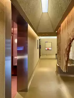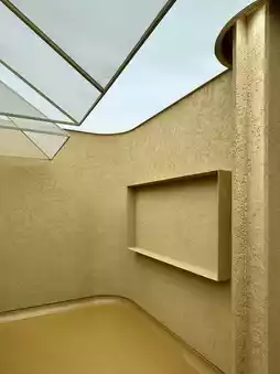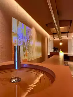 The space is styled in a calming Zen-meets-summer vibe, with soothing tones of orange and beige that make it feel both peaceful and energizing — perfect for a quiet moment or a stylish catch-up with friends.