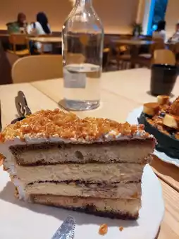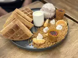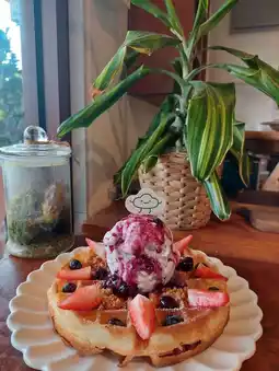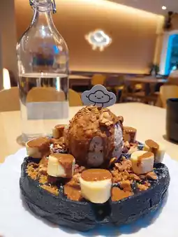 We got some of their waffles, Snoopy & Peanut (charcoal waffle/banana/peanut butter ice cream/nuts). It is so churchy! Next we got a Alice in Wonderful (blueberry ice cream/fresh berries) it’s very sweet but very good. We also tried their tiramisu cake slice which has caramel on top, so good and creamy! For drinks, we got a ice blended chocolate to enjoy, so rich and satisfying.