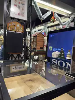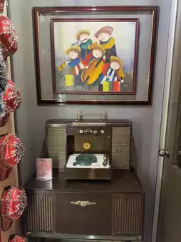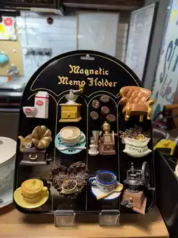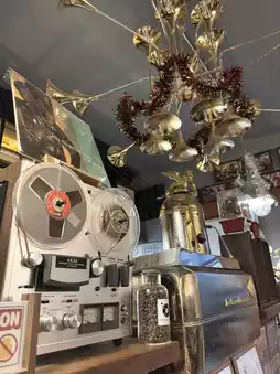 The Christmas tree stood adorned with golden bells and red ornaments, perfectly complementing the café’s retro vibe. We couldn’t resist exploring the shelves lined with vinyl records, antique audio equipment, and whimsical coffee-themed magnets. The centerpiece? A vintage reel-to-reel tape recorder, adding a unique touch to the holiday atmosphere.