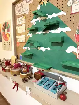 The decor was an absolute treat! A charming handmade Christmas tree adorned the wall, while festive accents like candy canes, Santa ornaments, and glittering garlands added a whimsical touch. The thoughtful little details, like the red ribbons and gift boxes, made everything feel extra special. There was even a “Snowball Challenge” board to keep the holiday fun alive!