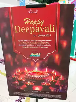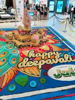 Starling Mall is glowing with festive spirit this Deepavali, thanks to the vibrant decorations by Jati. The centerpiece of the celebration is a stunning kolam design — a traditional Indian floor art — created with colorful patterns and intricate details that symbolize prosperity and good fortune. The vivid hues and symmetrical motifs draw in visitors, capturing the essence of the Festival of Lights.