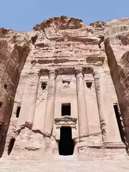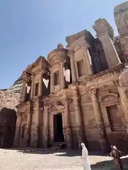 🇯🇴-1.2Around 100 BC, the Nabataeans, who were good at business and had flexible minds, made #Petra the largest trade center at the time, controlling the trade route between #Arabia and Damascus. It was also a transit station on the Maritime Silk Road, where goods (spices, frankincense, myrrh...) were transported from here to India or China. In 106 AD, Nabataea was peacefully incorporated into the Roman Empire, and the ancient city was renamed #petra (from Greek, meaning stone). After being incorporated into Rome, parts of the city were rebuilt according to Roman design elements, the Roman theater was expanded, stone roads were paved in the city center, and many buildings and statues were added. Therefore, Roman architectural remains can be seen in Petra. After passing Al-Khazneh, I chose the High Place of Sacrifice Trail on the recommendation of the local Bedouins. The locals’ recommendation turned out to be correct. Along the way, I could see the Street of Facades, the Royal Tombs, etc. At the altar on the top of the mountain, I met enthusiastic Bedouins who invited me to join them for morning tea. I took the hot mint sweet tea he gave me and listened to him talk about the past of this land. As we chatted, I felt my heart floating in the air with the aroma of the Bedouin sweet tea. Maybe there is a Bedouin soul in some part of me. After saying goodbye to the Bedouins, I continued along the mountain road towards the monastery (Ad-deir / Monastery). The monastery is the largest and most legendary building in the ancient city of Petra. At first glance, it looks the same as the Khazneh Temple, but the monastery is larger, 47 meters wide and 48.4 meters high. The two-story building is carved into the mountain wall, with side platforms on both sides. It used to be a meeting place for religious groups. It was used as a Christian church during the Byzantine period. A cross is carved on the back wall, hence the name monastery. I also had a good rest here, sitting in the small tea stall facing the monastery and playing with Mimi, who was not afraid of strangers but wanted to conquer the earth. Then, on the way back, I first walked along the main road, Street of Facades, and then went around the Royal Tombs. Along the way, we discovered that Petra has many diverse architectural and decorative styles. It combines different elements such as Greek, Assyrian, Roman, Mesopotamian and Egyptian. These are all the knowledge the Nabataeans gained through trade and exchanges with the outside world. They extracted design elements and techniques from them, and then integrated them with their national style to create great buildings that still amaze the world thousands of years later.
