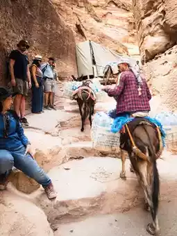 But soon the silence fades. Hundreds of stone steps ahead become a bustling path of tourists, passing each other up and down. Some ride donkeys, others camels, and some carry water and supplies, as if they were still serving in ancient caravans.