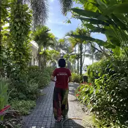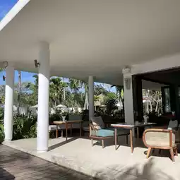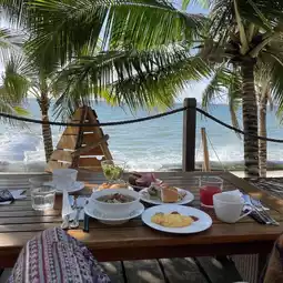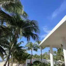 The next morning, I went out for breakfast and was amazed by the view of the palm trees, the ocean, and the pool. It was so pretty...