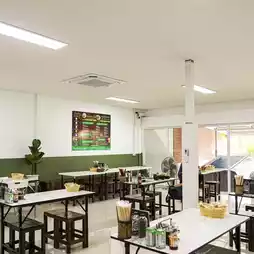 Green and white tones, super cute cafe feel, there are both noodles