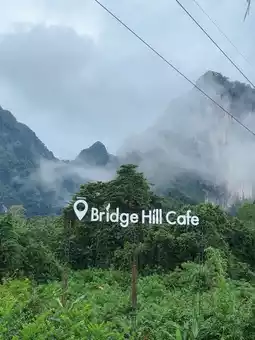 Okay, I went to Khao Sok, Surat Thani. On the Surat Thani-Phang Nga road (Route 410), near Khao Sok, there is a cafe right on the road called Bridge Hill Cafe. The view is great. I went when it was raining. The fog and rain fell, contrasting with the high and steep mountains in that area, which was unusually beautiful.