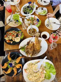 at Khanom Rim Lay, Phatthalung. The atmosphere is amazing, right on the shores of Songkhla Lake. The cool breeze and the stunning sunset views are simply breathtaking. The food is delicious and varied, with fresh, spicy seafood and a full range of local dishes. Foodies are sure to love it.