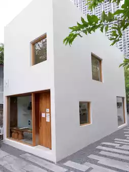 The shop is a box-shaped Japanese minimal style.