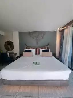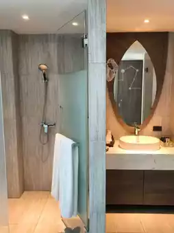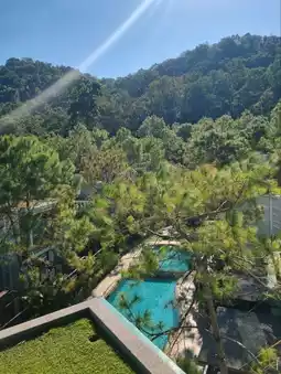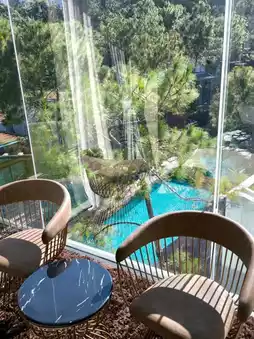 The hotel has a building and a villa type. There are 2 types of buildings on top of the building. There is a rooftop viewpoint where you can go up and sit and enjoy the mountain atmosphere. You can see the view in 360 degrees. There are Deluxe Rooms, Deluxe Exclusive, Grand Deluxe, and Corner Suite Rooms. If you want privacy, there are also Villa rooms. Private Villa and Grand Villa 2 Bedrooms. I chose to stay in a Deluxe Exclusive Room. The room was spacious, clean, with a large bed and comfortable bed. The facilities were complete. There was a large round sofa close to the glass for a comfortable view. The bathroom was divided into a wet and dry zone. The room had glass walls on both sides. You could see the swimming pool, forest, and mountains. The atmosphere was great.