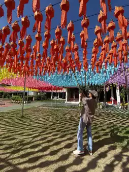 The Yi Peng festival is approaching, and the surrounding area is decorated with Northern-style lanterns, also known as Lanna lanterns, in a variety of colors.