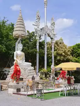 Wat Khoi, a beautiful temple in Phetchaburi, is a place to pray for good fortune and admire the beauty of Phra That Chim Phli Phra Setthi Navakoti, a unique Buddhist monument in the world. This stunning chedi boasts a stunningly beautiful interior. The lower level houses important Buddha images, including the Phra Buddha Setthi Navakoti. In front, you'll find the Phra Chao Tan Jai statue, along with Thao Wessuwan and other sacred objects. This is a significant temple in Phetchaburi. Don't miss this opportunity to pay your respects and pray for blessings.