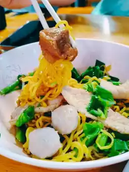 🍝Jay Nong's Red Pork Noodle Soup, located on Petchburi Soi 2, is a renowned noodle shop with a loyal following. The atmosphere is simple and casual, offering a homey feel. A highlight that captivates many is the noodle soup, which is rich and fragrant with spices. It's not too sweet or salty, with a perfectly balanced flavor and a distinctive reddish-brown color. The stewed pork is tender and melts in your mouth. The restaurant meticulously stews every piece, ensuring a satisfyingly flavorful texture. You'll be munching on the whole bowl without even realizing it.