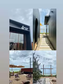 Located in Puek Tian Subdistrict, the cafe features a stylish black tone with a cozy vibe. Inside, the air-conditioned room has a popular spot with a window frame offering a view of the sea outside, perfect for taking photos from every angle. Outside, there are camping-style chairs mixed with Japanese aesthetics, providing a stunning sea view. It's recommended to visit in the afternoon when it's not too hot, and the atmosphere is delightful.