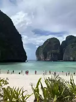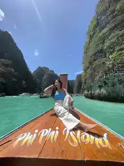 Maya Bay: You can't swim because sharks might come to say hello. If you are lucky enough to see one, and to preserve the nature of the seawater in that area, because our skin might be wearing sunscreen, which would cause the water to lose its balance, they don't allow swimming. ~~