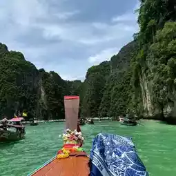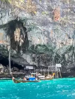 Lunch on Phi Phi Don was delicious (or maybe we were just really hungry), and we even grabbed some drinks from a café—Thai milk tea for me. After that, we cruised by the Viking Cave, then stopped at Pileh Lagoon for some epic photo ops from the long-tail boat, surrounded by emerald waters and dramatic cliffs.