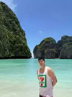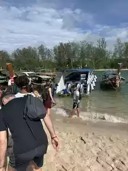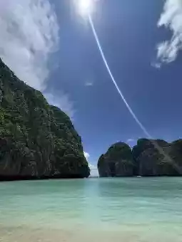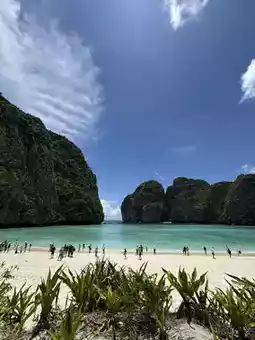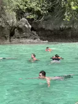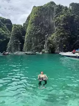 Day 2 We had breakfast at the hotel and drove to Noppharat Thara Beach because we had booked a Phi Phi Island tour. It was a boat trip to the Phi Phi Islands, starting from Viking Cave, which is a cave with ancient paintings on the cave walls, and snorkeling for a while. Then we continued to Pileh Lagoon, which is a cove with emerald water surrounded by steep limestone cliffs, perfect for taking pictures in front of the boat's bow.