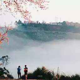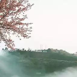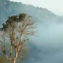 During the cool winter, the Himalayan cherry blossoms bloom, turning the entire mountain pink and green, enveloped in mist at certain times.