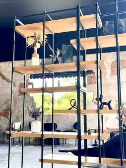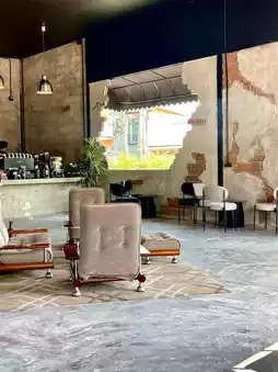 The shop is strikingly beautiful, with a loft-style, exposed concrete floor contrasted by large glass windows all around, allowing natural light to flood the space. The high ceilings create a spacious, airy atmosphere. The air conditioning is cool, the music is good, and there's plenty of seating. There are board games to play. Whether you're coming alone, as a couple, with a family, or with a group of friends, it's perfect for a quick photo opportunity. The lighting is beautiful.