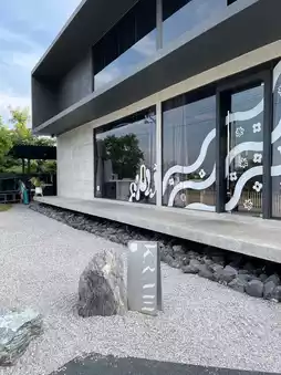 This restaurant is located right on the banks of the Nan River, offering stunning views. Decorated in striking black and gray tones, it's a stylish square shape. Parking is available both in front and behind the restaurant. They serve light snacks and a wide selection of drinks at reasonable prices. There are several photo spots, including a small room at the back. The front and side corners offer plenty of cool shots. There's plenty of seating, and even solo travelers can take selfies with the mirror. The coconut matcha is delicious, and the drinks are delicious. If you're passing Naresuan University, Phitsanulok, don't forget to stop by.
