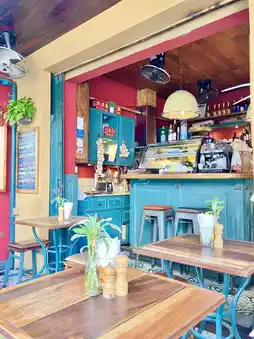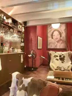The interior is small, but there is a nice counter on the first floor, and a red space that spreads out when you climb the steep spiral staircase to the upper floor.