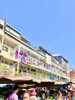 The retro apartments in front of the market, full of a sense of life, have a Cambodian feel📷