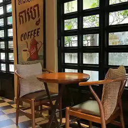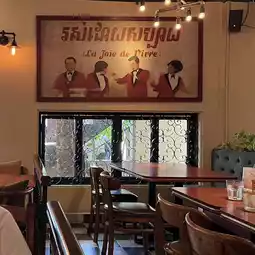 LA. CHRONIQUE CAFE & BISTRO is a cafe located in Phnom Penh, Cambodia. They offer both savory and sweet dishes. Prices are not too expensive, with drinks around $3 and dishes around $5. There's a wide selection on the menu. The staff are welcoming, helpful, and provide excellent service. The clientele is mostly foreign families, so there's a bit of chatter, but it's not loud enough to disturb other tables. The overall atmosphere is not hectic, but it's not as quiet as a typical cafe. There are many corners, perfect for taking photos, relaxing, and working, with power outlets.